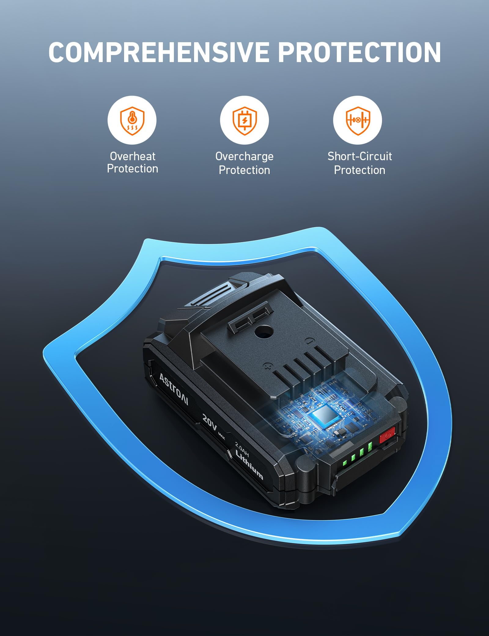 - Overheat Protection + Overcharge Protection: the li-ion battery pack will auto shut off when overheating or fully charged. These precautions provide safer using experiences for customers.