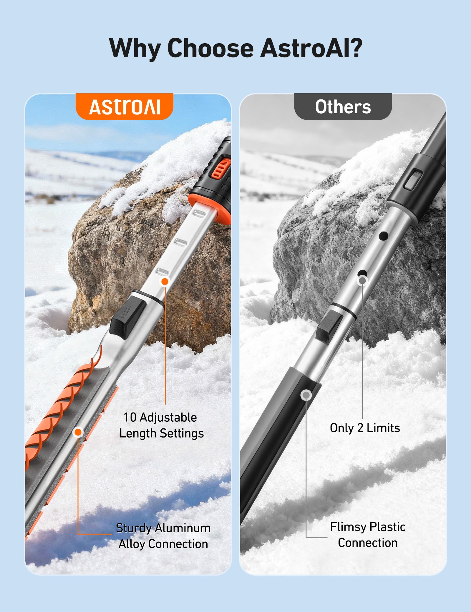 AstroAI 47.2" Ice Scrapers for Car Windshield, 3 in 1 Sturdy Snow Brush with Squeegee, 10 Adjustable Length Settings, Extendable Aluminum Handle, 180° Pivoting Snow Scraper for Car, Truck, SUV(Orange)