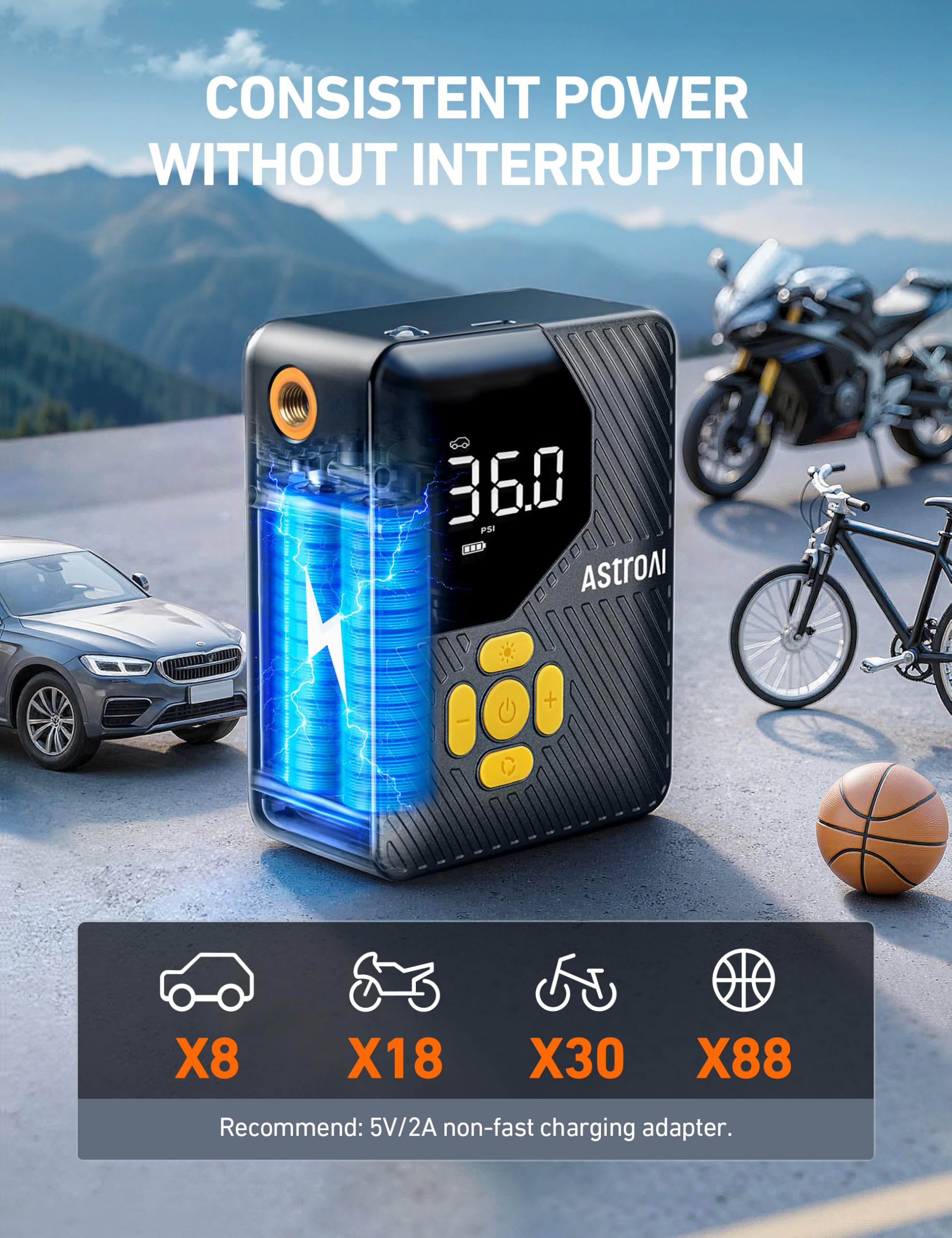 - LONG DURATION: Once the AstroAI mini tire inflator is fully charged, it can easily handle multiple inflation needs, efficiently inflating up to 8 car tires/18 motorcycle tires/ 30 bicycle tires/88 basketballs. Backed by a high-capacity battery pack, the L7 Mini, as part of new car accessories, is a reliable & long-lasting partner for camping, long trips, daily use, and beyond.