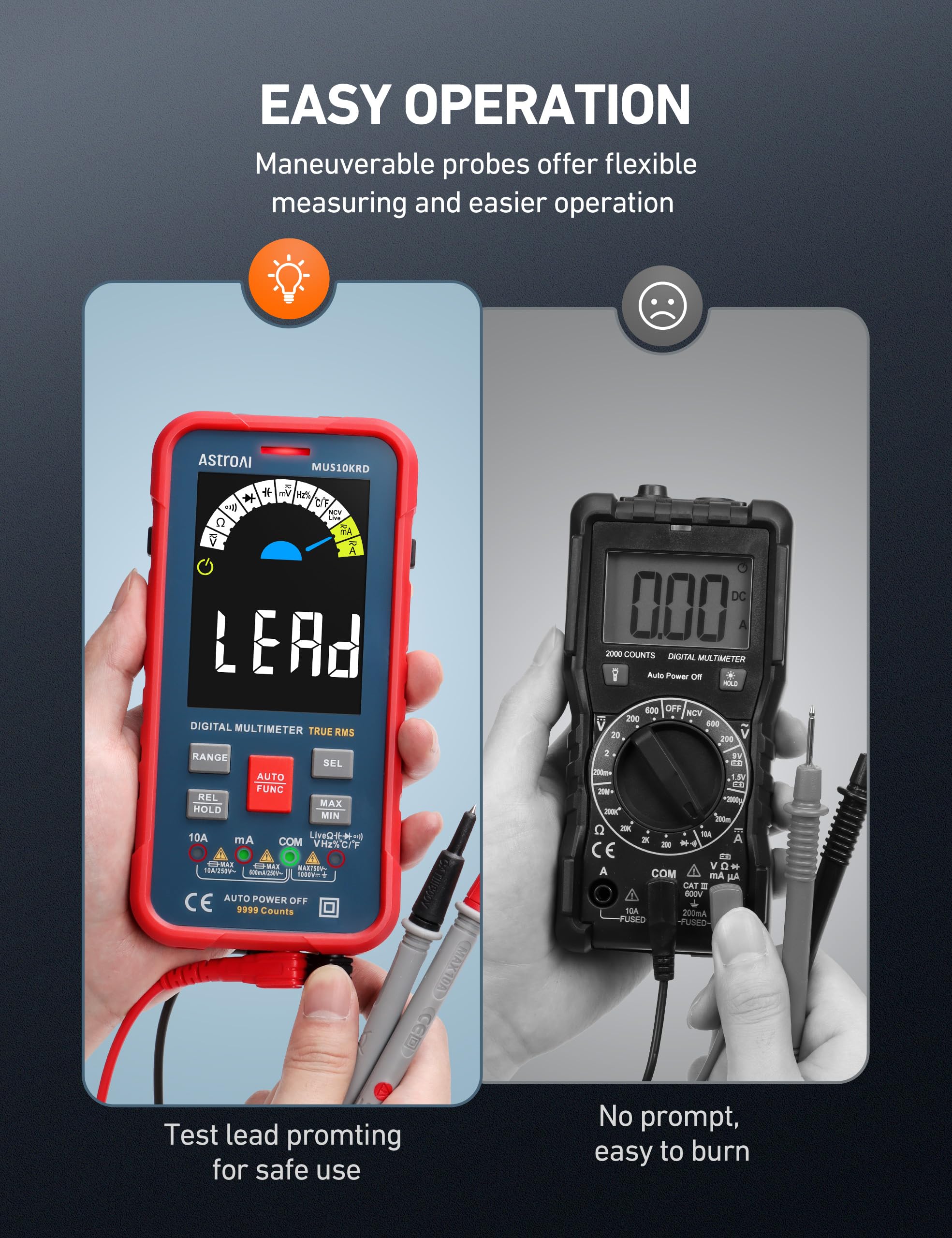 - Easy to use: The “SMART” mode of the multimeter can automatically identify voltage, resistance, and continuity. Smart tips for test leads, Real-time temperature display, Data Hold, MAX/MIN values, Auto Shut-down, Low battery prompt, Audio-visual alarm, Fuse Break reminders and other functions make measurement and recording more convenient. Fit both beginners and professionals.(The "SMART" function takes some time to judge the signal source, so there will be a little delay).