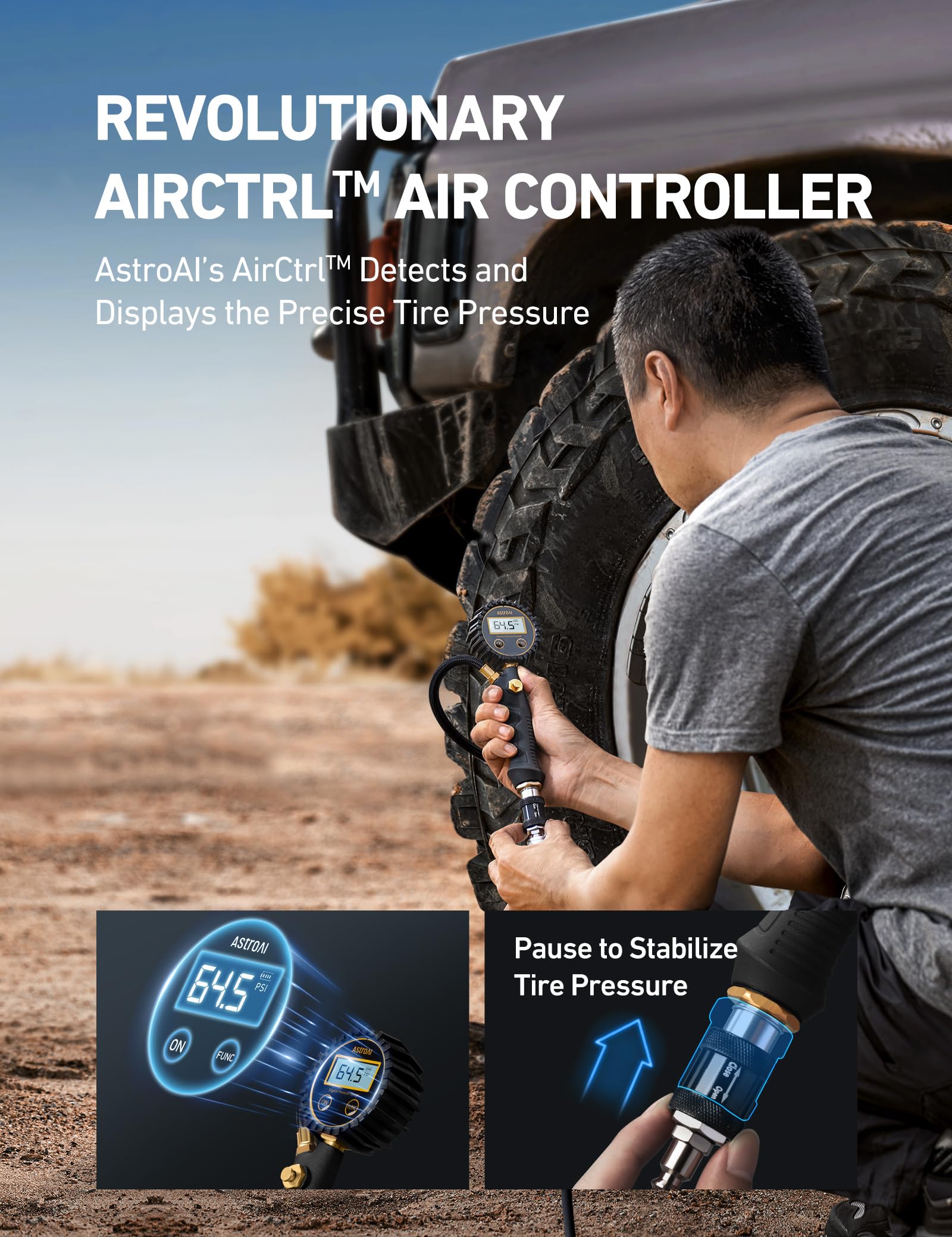 - INDUSTRY-FIRST AIRCTRL AIR CONTROLLER: The AstroAI T6 Offroad Air Compressor features a specially designed AirCtrl air controller, which includes a digital screen to display the precise tire pressure, an airflow valve to pause inflation for more accurate tire pressure monitoring, and a deflate button for one-press deflation. Intuitive operation, no more running back and forth.This tire pump is suitable as Father's Day presents,Valentine's Day Gift.