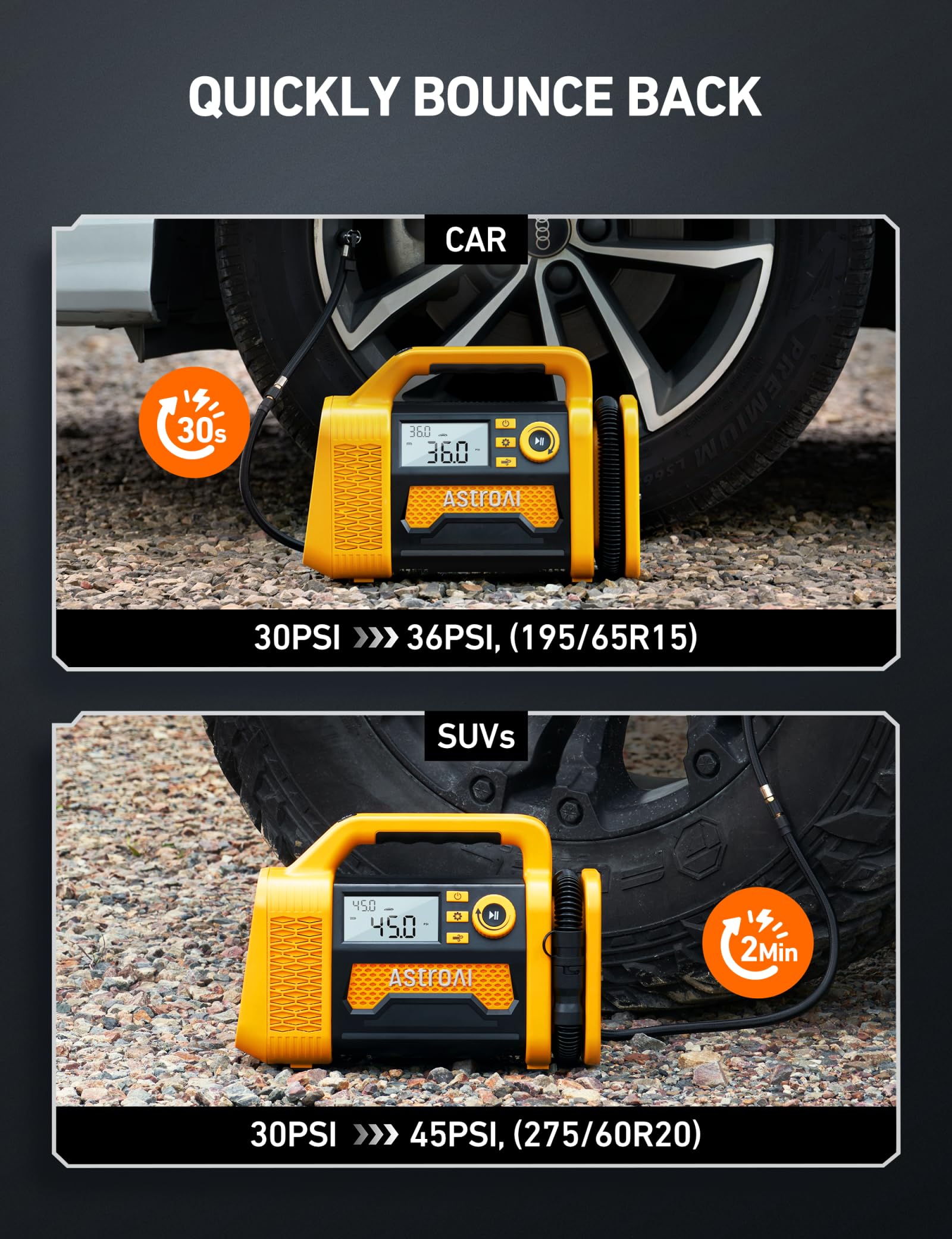 - AstroAIās Patented Technology: TurboRise technology incorporates advanced manufacturing techniques and high-quality materials to enable this air compressor to inflate an SUV tire(275/60R20) from 30PSI to 36PSI in 30 seconds. Its efficient heat dissipation design also helps to prolong its service life. Designed with power and precision, it stands out as one of the ideal gifts for men who have everything.